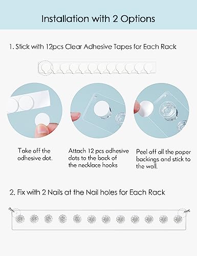 - سهلة التركيب على الحائط- تركيب مع خيارين لكل رف حامل سلسلة. خيار 1: ألصقها مع 12 قطعة من الأشرطة اللاصقة الشفافة. خيار 2: ثبتيها بمسمارين عند ثقوب المسامير. جميع الأشرطة اللاصقة والمسامير متضمنة في العبوة.