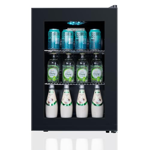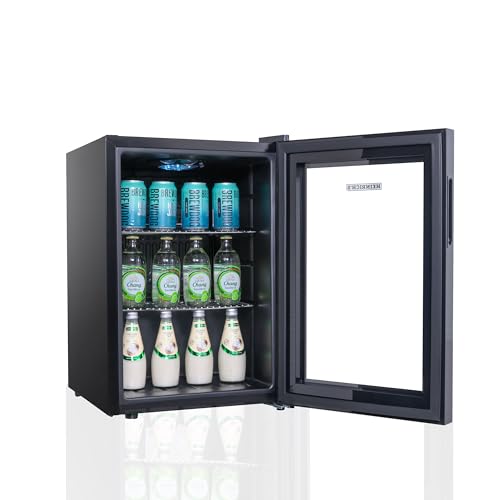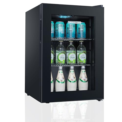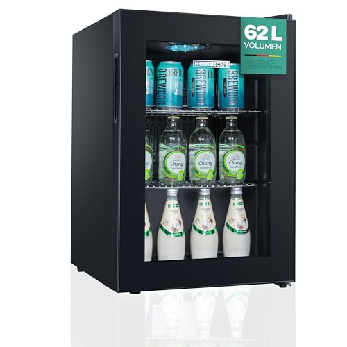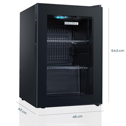 Heinrich´s - ثلاجة مشروبات صغيرة مع باب زجاجي ، وهادئة: 40 ديسيبل اضاءة داخلية LED مثالية للمكتب والتخييم والحديقة من 4 الى 18 درجة مئوية اسود (62 لتر 2 رف [انيرجي هاينريش عدد 10