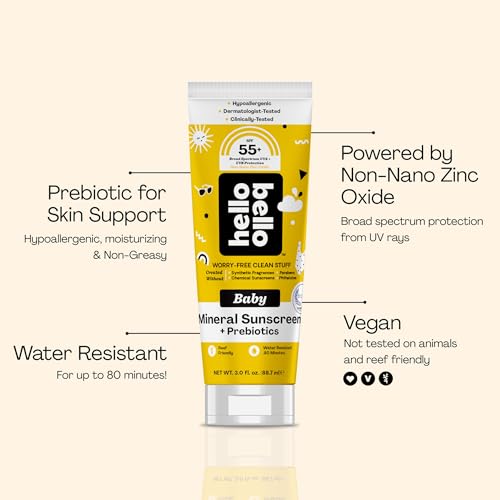 Hello Bello - واقي شمس معدني مع أكسيد الزنك، حماية واسعة النطاق من الأشعة فوق البنفسجية UVA/UVB بعامل حماية 55، مقاوم للماء ولا يسبب الحساسية مختبر سريريا من قبل أطباء الجلدية من هالو بيلو، 88 ملليلتر (1 قطعة)