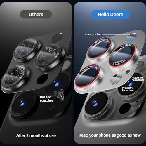 HelloDeere - واقي عدسة الكاميرا متوافق مع موبايل آيفون 16 برر ماكس/ 15 برو ماكس / 14 برو ماكس [تغطية كاملة من المعدن] [مقاوم للكسر بدرجة عسكرية] [امتصاص قوي] زجاج مقوى بدرجة صلابة 9H من هيلو دير، لون فضي