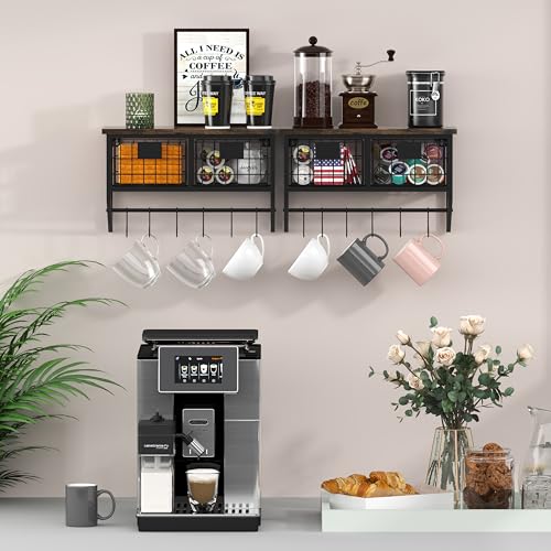 Helsin - ارفف عائمة من الخشب المعدني تثبت على الحائط مع سلال وخطاطيف من هيلسين، رف عرض معلق وحامل متفرقات للمقهى والمطبخ وتنظيم الحمام وديكور المنزل، اسود (16 انش، مجموعتان)