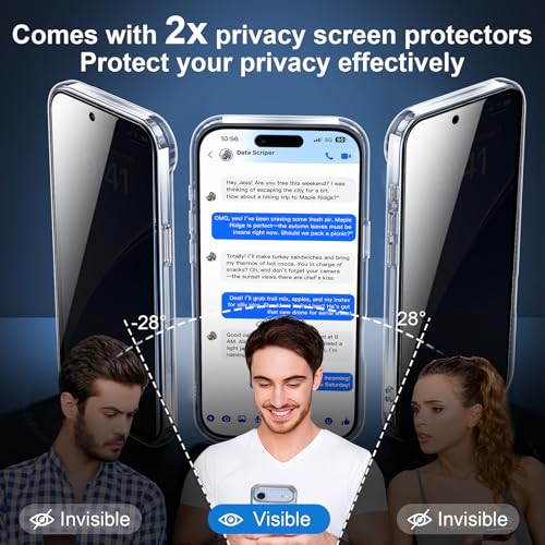 - [2 طبقة حماية من الزجاج المقوى للخصوصية] أغطية شاشة الخصوصية لهاتف ايفون 17 اير من هيلسيتوت، مصنوعة من مواد جديدة من ألمانيا، فلتر الخصوصية المتطور يحجب الرؤية من أي زاوية أكبر من 28 درجة. الشاشة مرئية فقط للشخص الذي أمامها مباشرة. تحمي خصوصيتك بشكل فعال من النظر.
