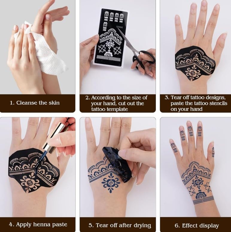 - ▶ 【مجموعة تاتو الحناء】 1 ورقة استنسل للوشم. استنسل حناء لليدين. استنسل تاتو بالهواء مناسب لعشاق التاتو. مجموعة تاتو حناء للمبتدئين. جربي تأثيرات الوشم دون ألم.