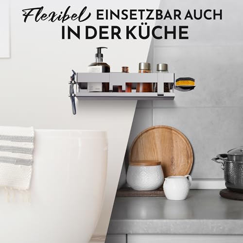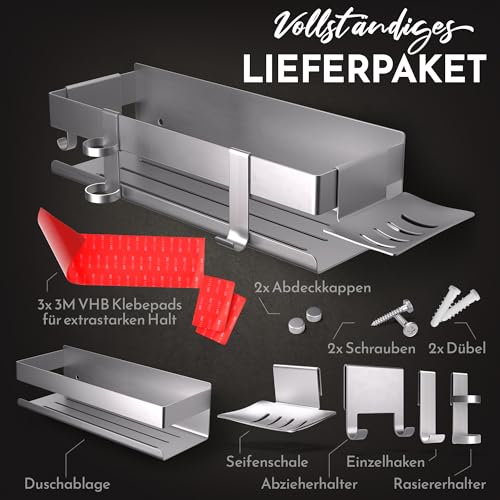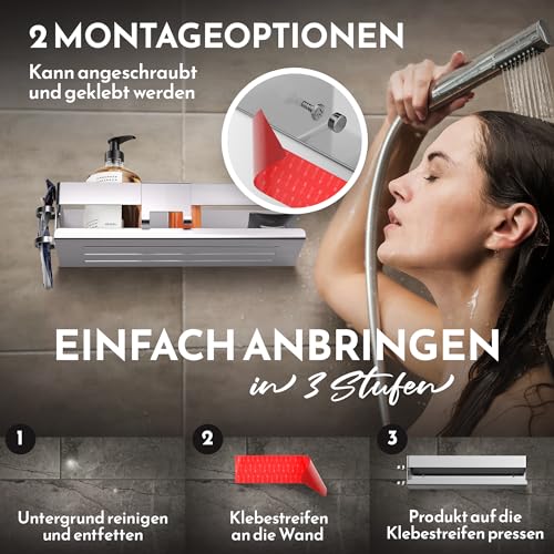 - لاصق أو ثقب - من السهل جدًا تثبيت منظم الحمام عن طريق اللصق دون حفر في الحمام، اختياريًا للتثبيت بالبراغي لتحقيق أقصى قدر من السلامة، يتضمن تعليمات لاصقة مفصلة باللغة الألمانية لرف الدش بدون ثقب.