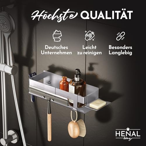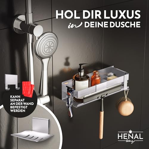 HENAL - مجموعة رفوف دش 5 في 1 من هينال® رف الستانلس ستيل بدون ثقب مصقول غير لامع بما ذلك حامل شفرات الحلاقة وحامل ممسحة الدش وطبق صابون وخطاف منظم حمام