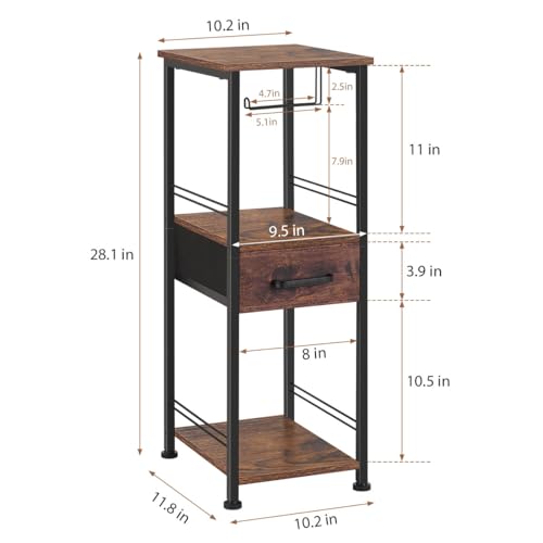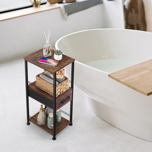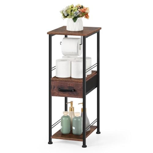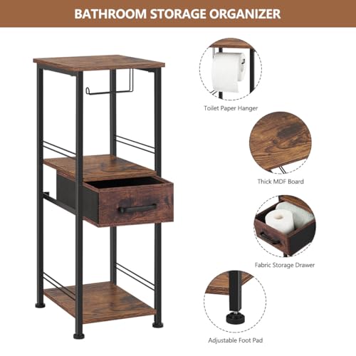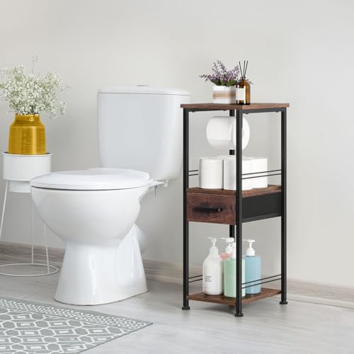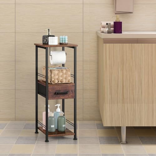HEOMU - هيومو خزانة تخزين رفيعة للحمام مناشف قائمة بذاتها حامل خشبي لحمل ورق التواليت منظمات حمام معدنية من 3 طبقات ومنظم رف مع درج والغسيل