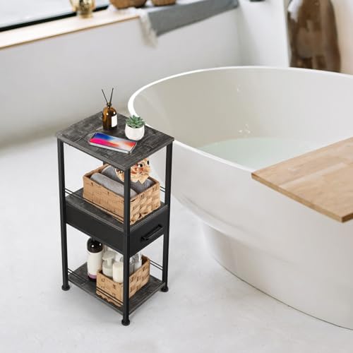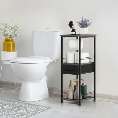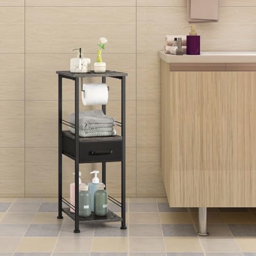 HEOMU - هيومو خزانة تخزين رفيعة للحمام مناشف قائمة بذاتها حامل خشبي لحمل ورق التواليت منظمات حمام معدنية من 3 طبقات ومنظم رف مع درج والغسيل مدهون