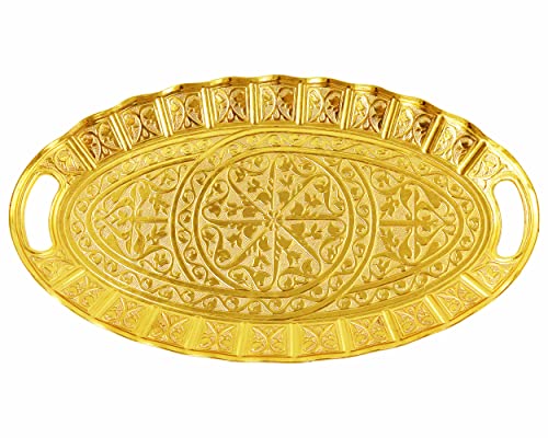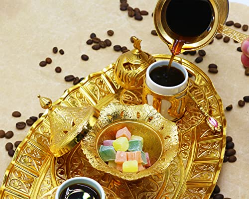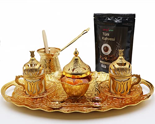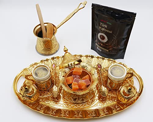 HeraCraft - مجموعة كاملة لتقديم القهوة التركية الذهبية الفاخرة من 10 قطع مع قهوة تركية كلاسيكية 100 غرام ووعاء 215 مل و2 كوب وصحون و1 صينية تقديم بيضاوية و1 وعاء سكر و4 ملاعق الكل في واحد ستانلس ستيل