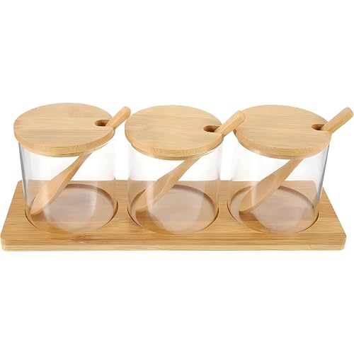 Generic - تخزين الاعشاب والتوابل - طقم برطمانات زجاجية متينة مع اغطية من الخيزران، 3 ملاعق خشبية وحامل خشبي لعرض توابل المطبخ المنظم