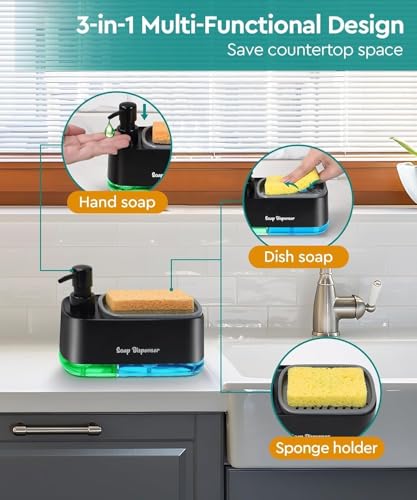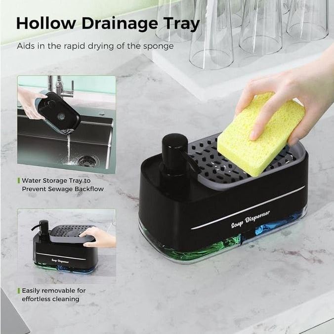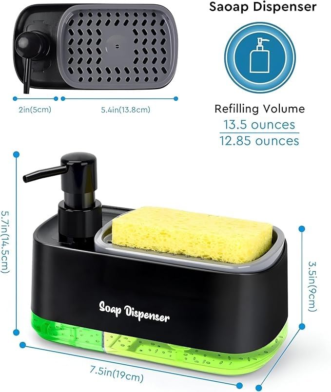 - **منتج عملي للغاية**: يوفر دسبنسر الصابون (3×1) وسفنجه مواعين حلا عمليا وفعالا لتنظيف المطبخ أو الحمام.