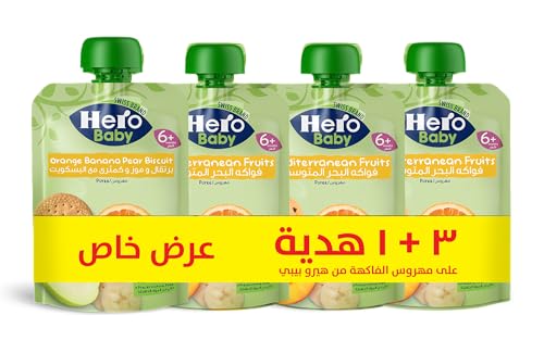 Hero Baby - مجموعة مهروس فاكهة البحر المتوسط من برتقال وموز وكمثرى مع بسكويت للصغار من 3 قطع مع واحدة مجانية من هيرو بيبي