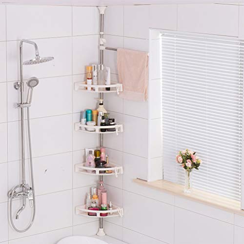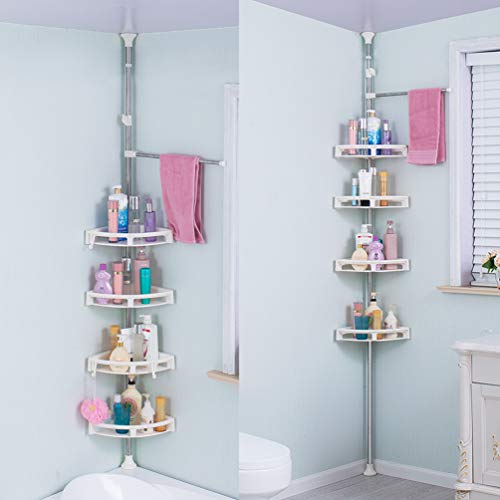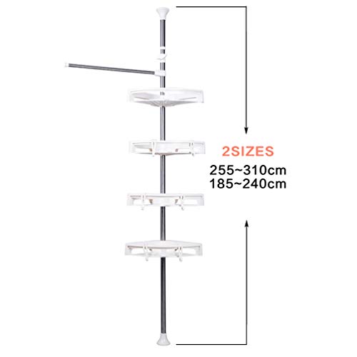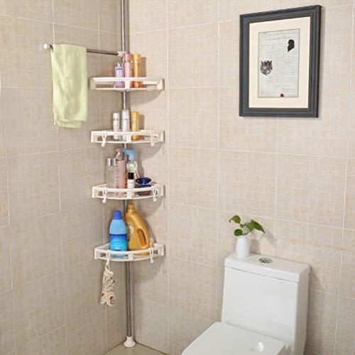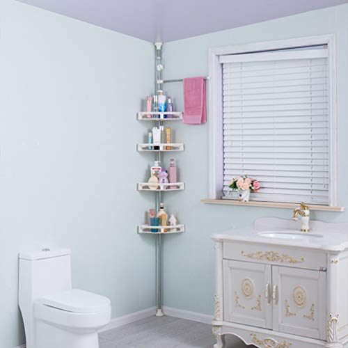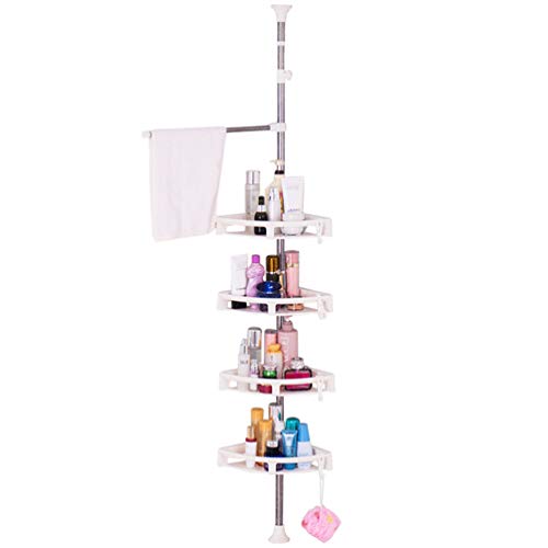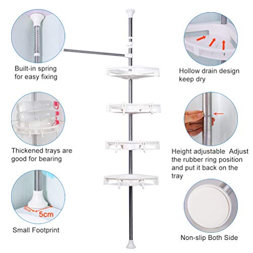 - متعددة الأغراض وموفرة للمساحة: 4 طبقات من حوامل البلاستيك بتصميم مثلث لحمل مستلزمات الاستحمام بما في ذلك الشامبو والبلسم والشفرات والفوط والصابون ولعب استحمام الأطفال وما إلى ذلك. مع بارات حمل الفوط والتي يمكنها الدوران بزاوية 360 درجة لسهولة تعليق الفوط أو الملابس. تحتوي الحوامل على درابزين لمنع مستلزمات الحمام من الانزلاق، ومزودة بـ 6 خطافات لتعليق الأشياء الصغيرة، مثل إسفنجة الحمام والفوطة والفرشاة، وما إلى ذلك.