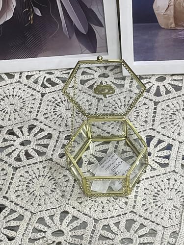 • تصميم فريد: صندوق مجوهرات سداسي الشكل بإطار ذهبي أنيق وجوانب زجاجية شفافة للعرض الأمثل