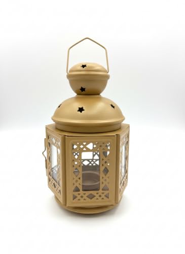 - تصميم فانوس سداسي: فانوس زخرفي معدني بتصميم سداسي الأضلاع مع نقوش هندسية معقدة وفتحات نجوم على القبة العلوية لإضاءة محيطة ساحرة