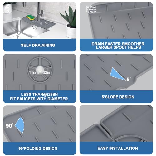 - ❄【سهل التنظيف】تصريف سريع: بساط سيليكون لصنبور المطبخ مقاوم للماء والزيت، لا يتلف بسهولة، لا داعي للخوف من الأوساخ، تدفق نظيف ومنفذين لتصريف المياه تدفق ثنائي الاتجاه، يسرعان من التجفيف.