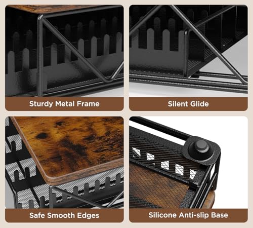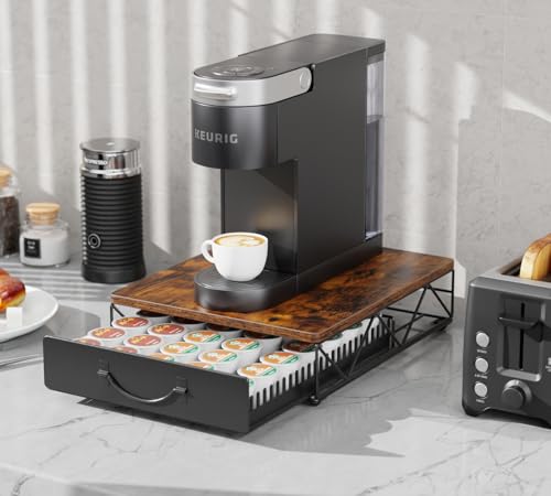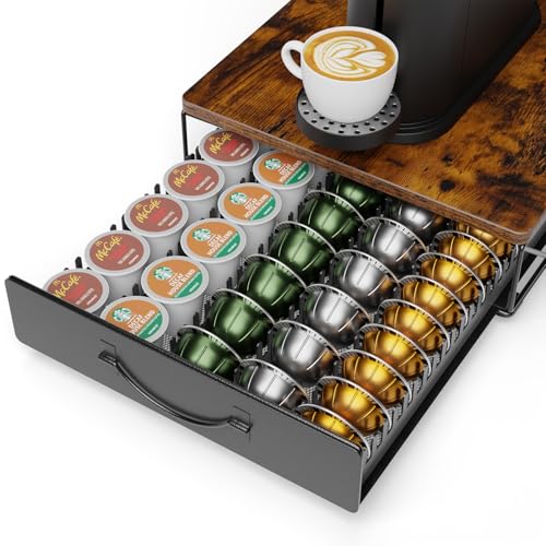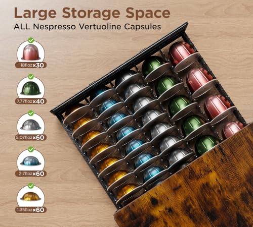 HFHOME - اتش اف هوم حامل كبسولات فيرتو متوافق مع نسبريسو فيرتولين 40 كبسولة كبيرة او 60 كبسولة صغيرة، سطح خشبي ورفوف شبكية، منظم طاولة المطبخ مع درج منزلق، بني ريفي