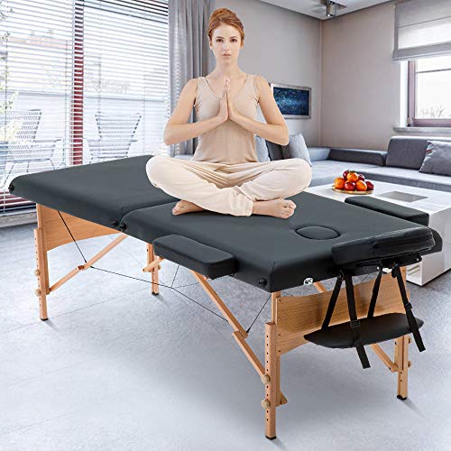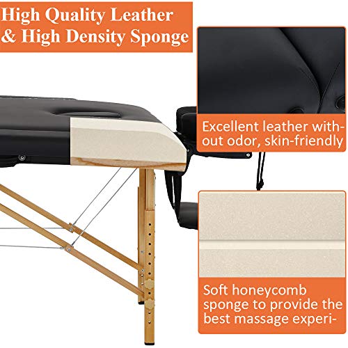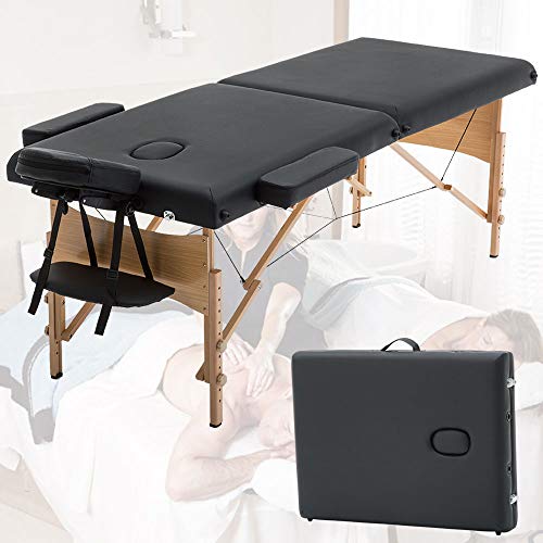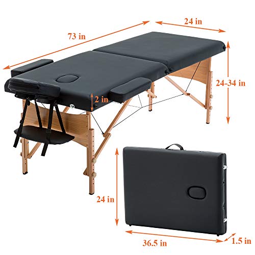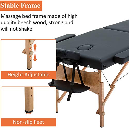 HHS - ترابيزة مساج محمولة سرير تدليك خفيف الوزن بارتفاع قابل للتعديل لصالونات التجميل وتنظيف الوجه مقاس 73 بوصة احترافي مع 2 تركيب رموش للطي وشنطة تخزين وحمل للمنزل والسبا اسود
