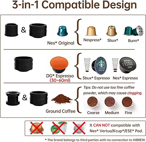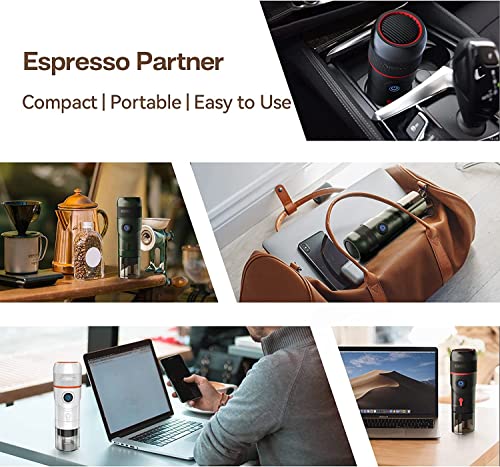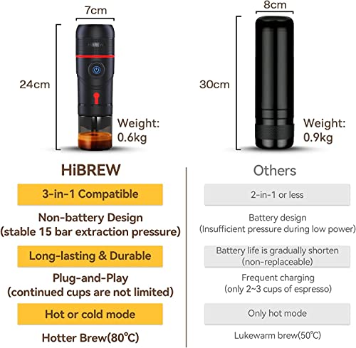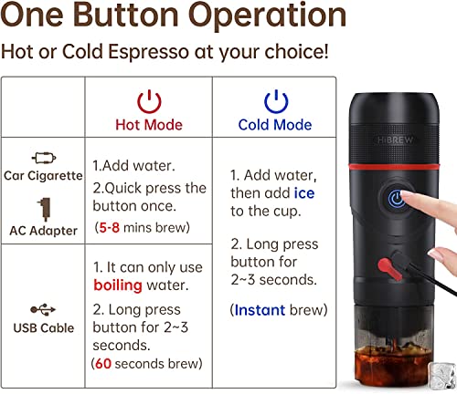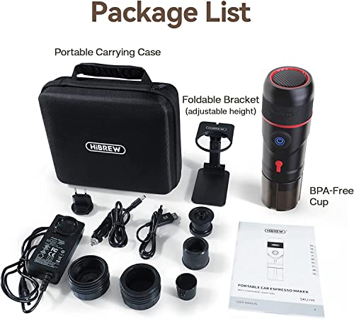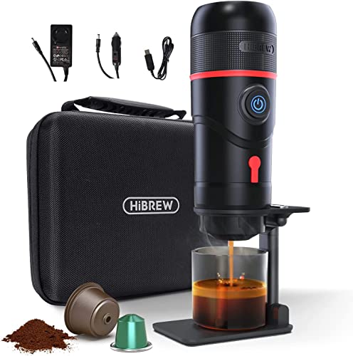 HIBREW - ماكينة تحضير القهوة بتصميم محمول لكبسولات الاسبريسو من هايبرو، مناسبة للاستخدام المنزلي وفي السيارة وللمكتب وفي الاماكن المفتوحة مع منفذ USB ومحول للسيارة والمنزل وحافظة، ستانلس ستيل، أسود