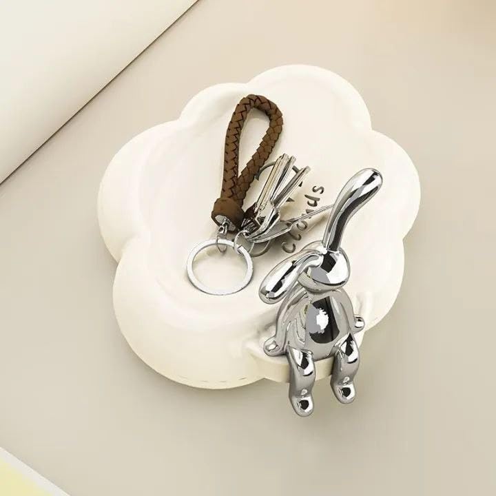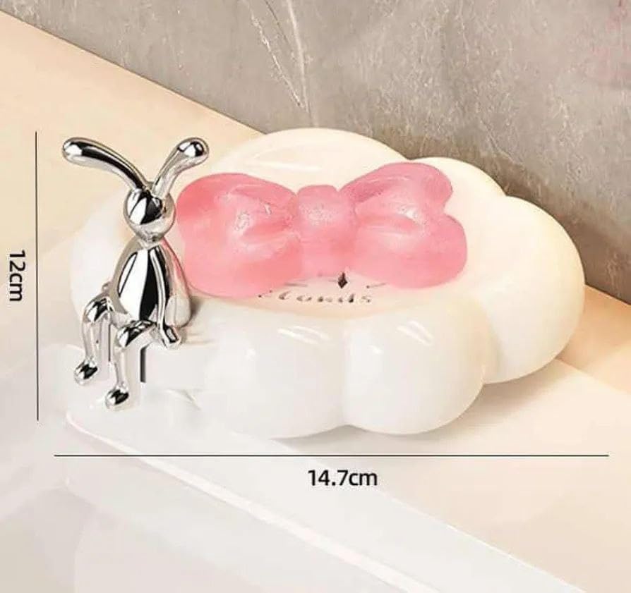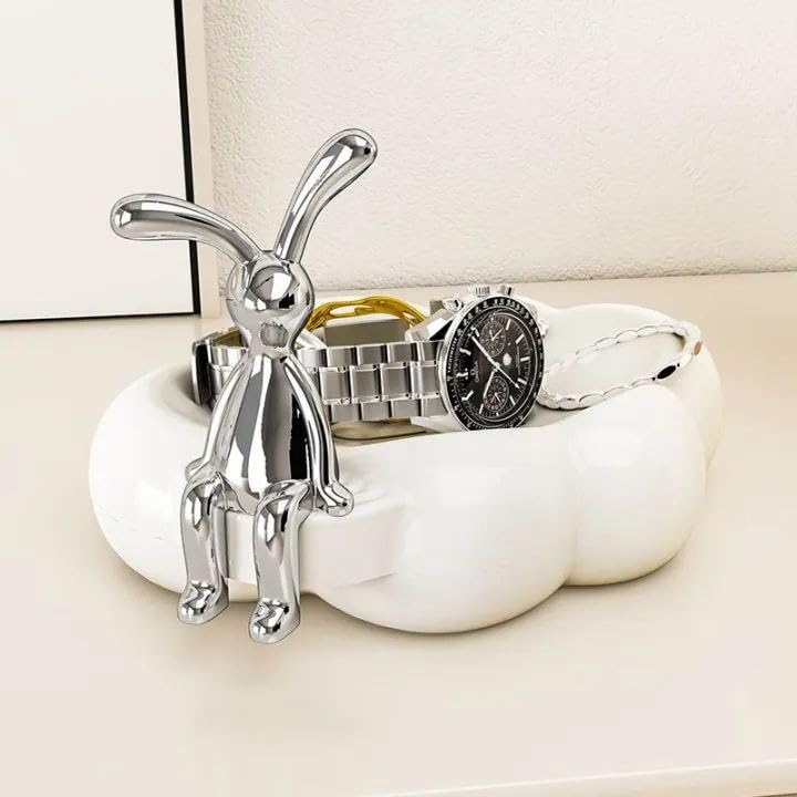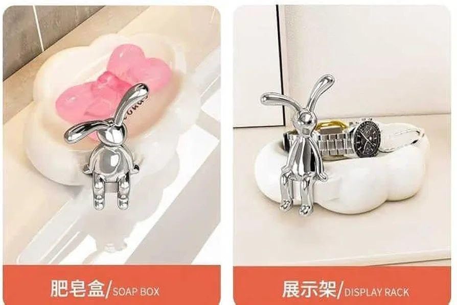 Generic - طبق صابون سي ان عالي الجودة مع ارنب فضي لامع - صينية تخزين فاخرة لقوالب الصابون والاسفنج والخواتم والضروريات اليومية في الحمام او المطبخ (ابيض، قطعة واحدة)