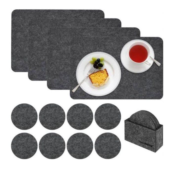 - مادة لباد عالية الجودة: مصنوعة من لباد متين ومقاوم للحرارة وطارد للماء، تحمي هذه المجموعة طاولتك من الحرارة والخدوش والانسكابات والبقع مع الحفاظ على ملمس ناعم وفاخر.