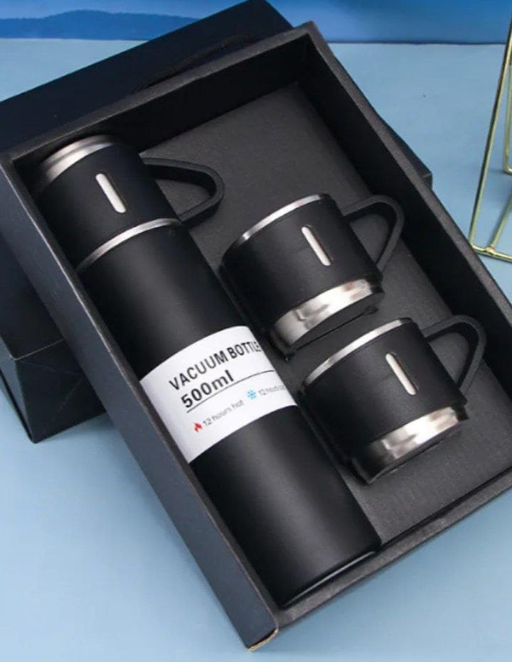 Generic - زجاجة حرارية عالية الجودة من الستانلس ستيل سعة 500 مل مع 3 اكواب تقديم - هيكل متين وامن من الستيل 304، ممتازة للمشروبات الساخنة والمرطبات الباردة والمغامرات الخارجية (اسود قطعة واحدة)