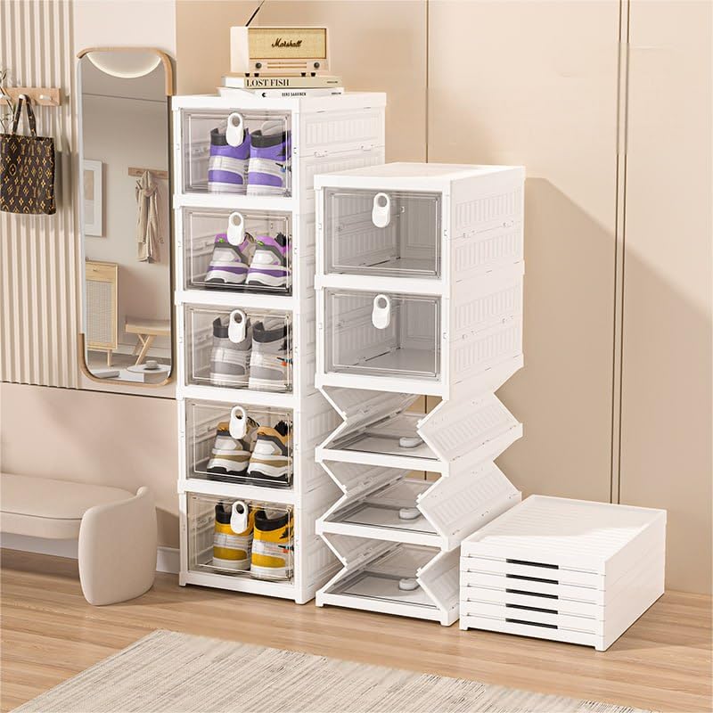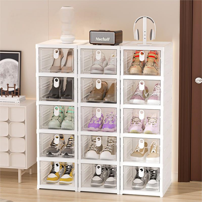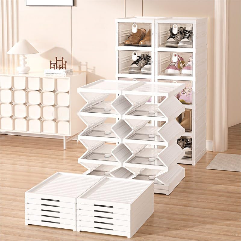 - تصميم نموذجي: صناديق تخزين أحذية قابلة للتكديس مع أبواب أمامية منسدلة شفافة لسهولة الوصول ورؤية الأحذية المخزنة