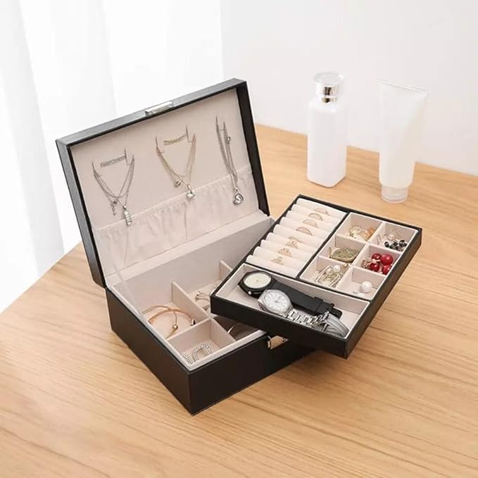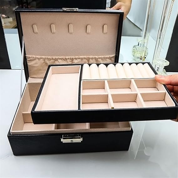 Generic - علبة أكسسوارات للمجوهرات مصنوعة من جلد عالي الجودة مع قفل وغطاء منظم من طبقتين، حافظة تخزين وفواصل قابلة للإزالة لترتيب السلاسل والساعات، تصميم عملي تصميم من دورين لتنظيم أنيق وذكي