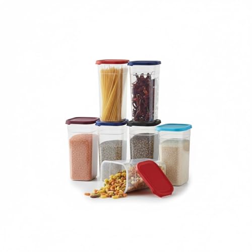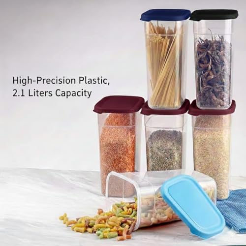 Generic - حاوية تخزين بلاستيكية عالية الجودة، طقم 6 قطع، سعة 2 لتر، أغطية ملونة، حاويات شفافة للمطبخ لتخزين المكرونة والحبوب والمكسرات، محكمة الإغلاق