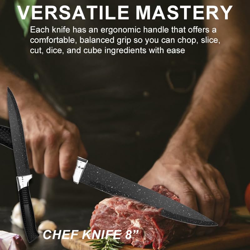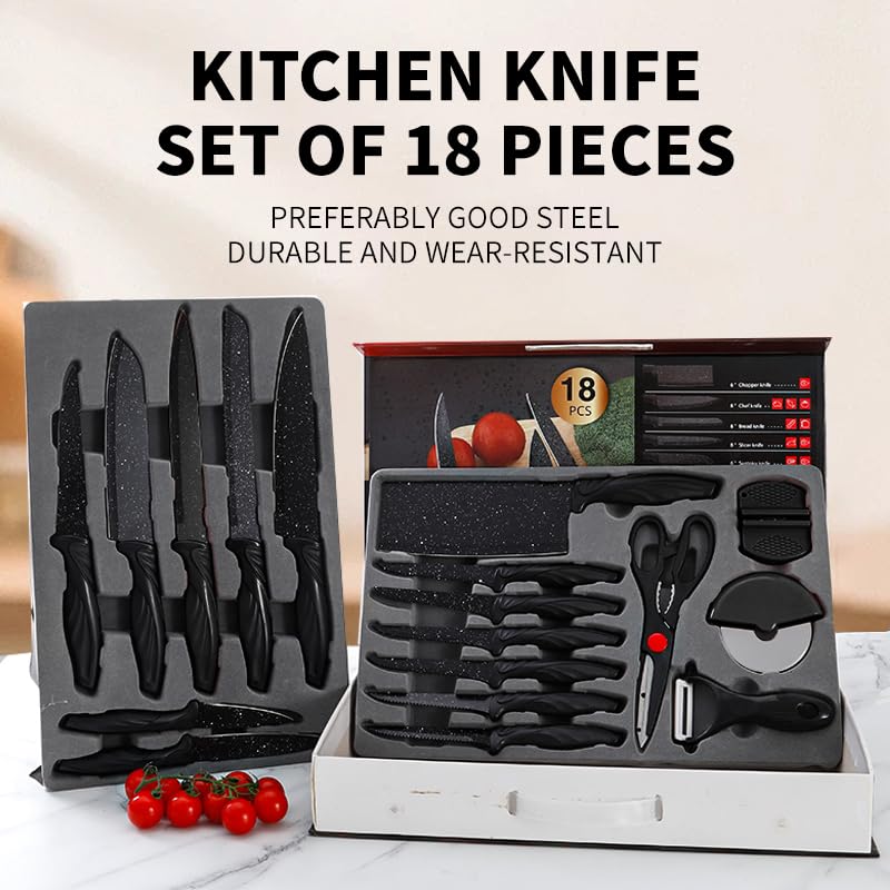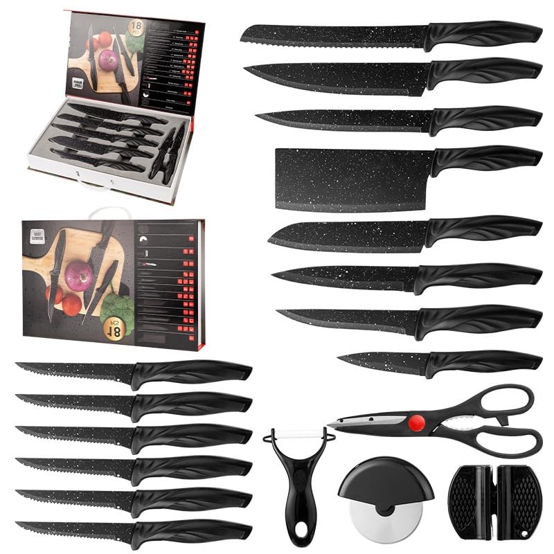 Generic - سكاكين حادة عالية الجودة من الفولاذ المقاوم للصدأ عالي الكربون مع طلاء مانع للالتصاق مع حافظة تخزين، سكين خبز وطاهي وسكاكين متعددة الاستخدامات وسكاكين تقطيع شرائح اللحم والبيتزا مع مبرد، طقم 18 قطعة