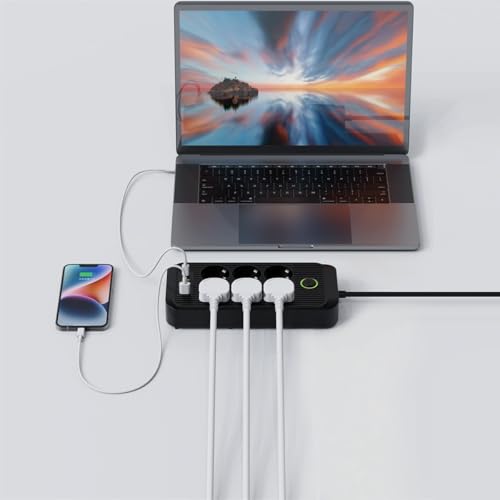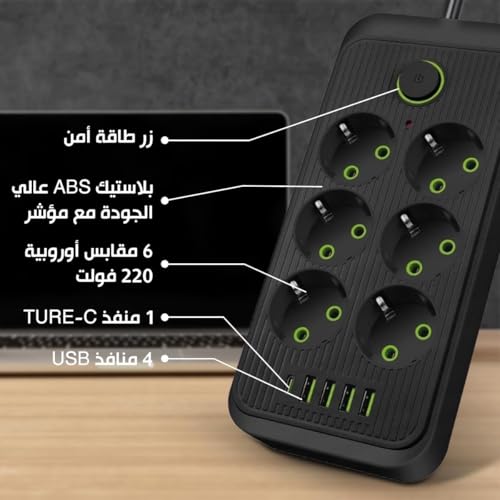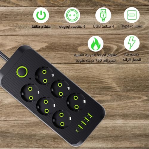 Generic - مشترك طاقة ذكي عالي الجودة من روكسي ستور، مع 4 منافذ USB، 1 منفذ من النوع C، خيارات ادخال مختلفة، حماية كهربائية فائقة، متعدد الوظائف، 2500 واط، اسود (الموديل: 606U (6 × سوكيت كومبو))