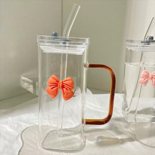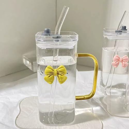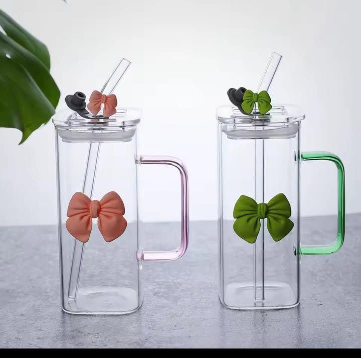 Generic - مج زجاجي مربع عالي الجودة بسعة 500 مللي، يأتي بغطاء زجاجي مستورد وشاليموه أنيق بفيونكة مميزة، يتحمل الحرارة والبرودة بألوان رائعة ومظهر فاخر. (عبوة من قطعتين)