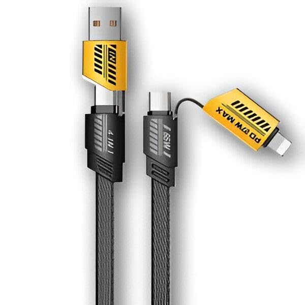 - يدعم كيبل الشحن السريع 4 في 1 كلاً من موصلات USB-C ولايتنينج، مما يضمن توافقًا سلسًا مع مجموعة واسعة من الأجهزة بما في ذلك الهواتف الذكية التي تعمل بنظام اندرويد وايفون وايباد وأجهزة ماك بوك، مما يلغي الحاجة إلى كابلات متعددة ويبسط روتين الشحن اليومي.