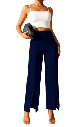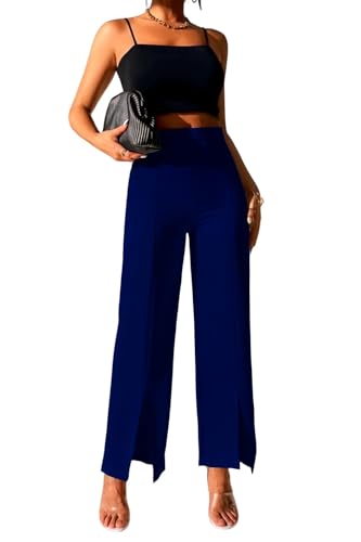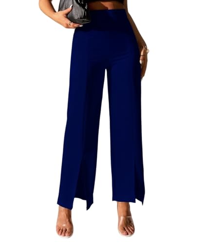 Generic - بنطلون بخصر مرتفع وارجل واسعة، ازرق كحلي، حافة منقسمة، طول الكاحل، مقاس L