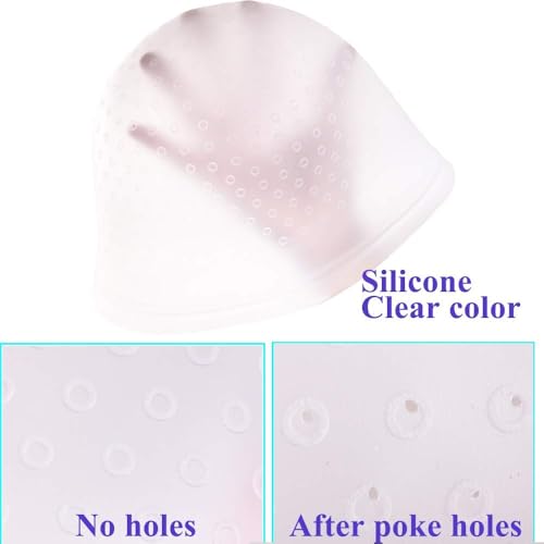 - ملاحظة: تأتي قبعة هايلايتينج فروستينج بدون ثقوب، يمكنك اختيار الأماكن التي تريد تلوينها، وحماية المكان الذي لا تريد تلوينه. قبل الاستخدام لأول مرة، يجب عليك ثقب الثقوب بنهاية حادة ساخنة من إبرة الانقلاب (سهلة الاستخدام)