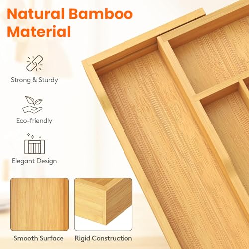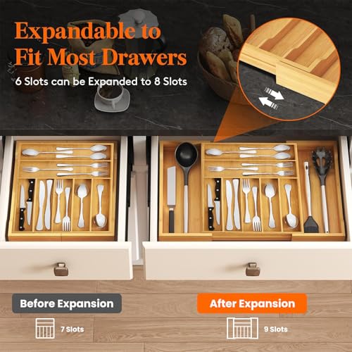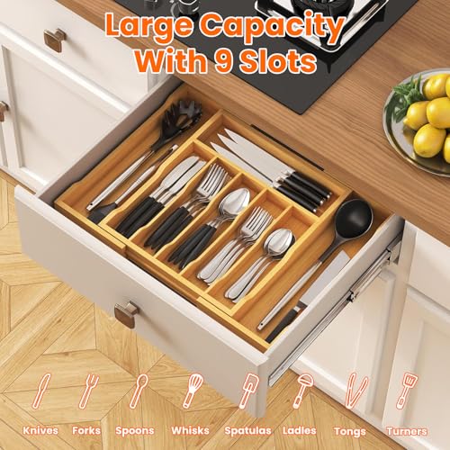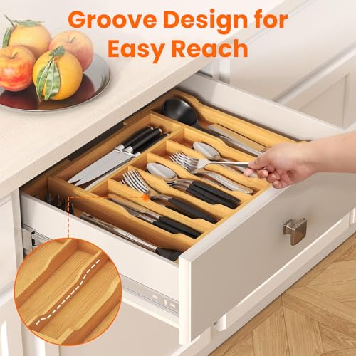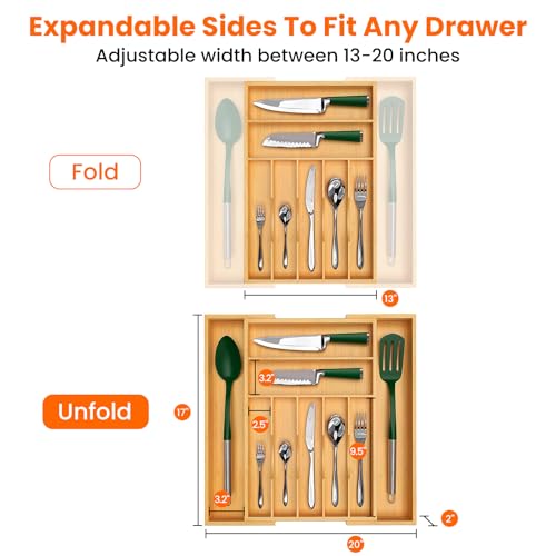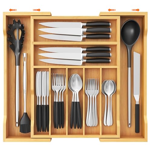 HIKKY - منظم ادراج ادوات المائدة من هيككي صينية كبيرة قابلة للتوسيع للمطبخ منظمات الفضية المصنوعة الخيزران لتخزين الملاعق والشوك والسكاكين