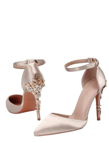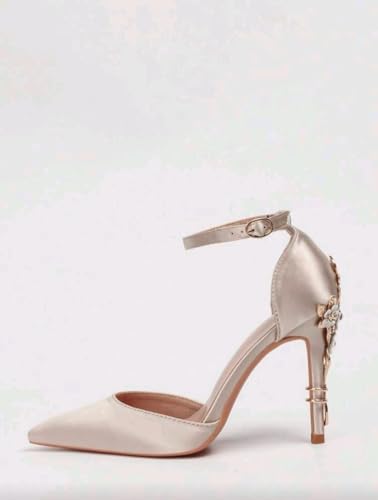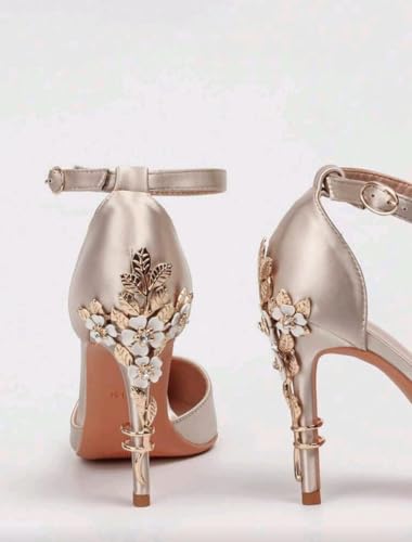 Generic - صندل بكعب عالي جلد حريمي هيلز مزخرف بورود معدنية مع ابزيم بحزام للكاحل كعب 12سم