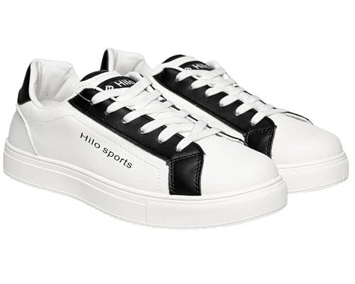 HILO - هيلو حذاء رياضي رجالي مريح وجيد التهوية وخفيف الوزن ومتين بتصميم بسيط وانيق، جلد مستورد فاخر، طباعة راقية، لسان فريد، حذاء رياضي ابيض كلاسيكي (اسود مقاس 41)