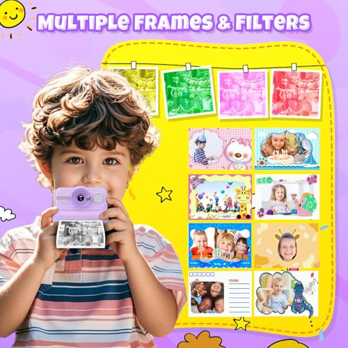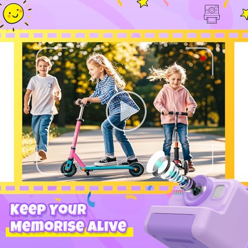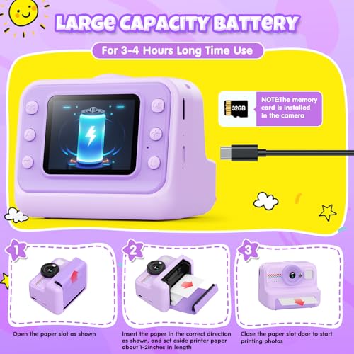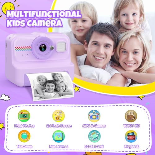HiMont - كاميرا طباعة فورية للأطفال من هاي مونت، بدقة 1080 بيكسل عالية الوضوح مع 3 بكرات ورق طباعة وبطاقة 32 جيجابايت، هدية مثالية للأطفال من سن 3 إلى 14 عامًا (لون أرجواني)