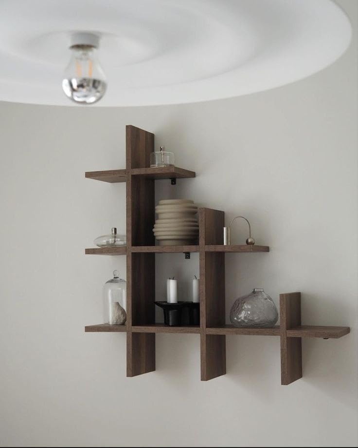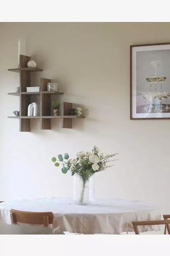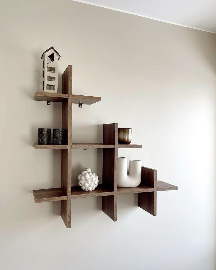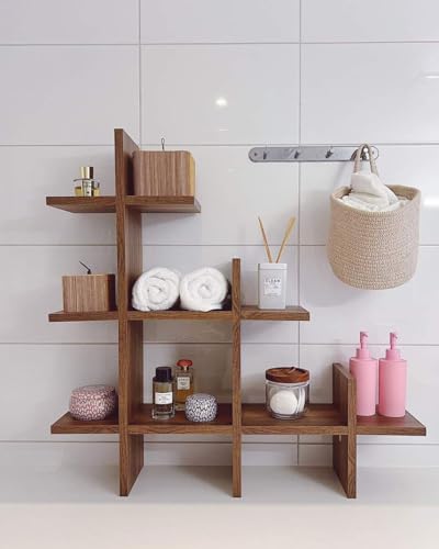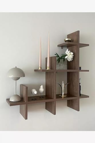 - تصميم مميز: يتميز هذا الرف المثبت على الحائط بنمط هندسي مثير للاهتمام مع ألواح خشبية متقاطعة تخلق مساحات تخزين مفتوحة متعددة.
