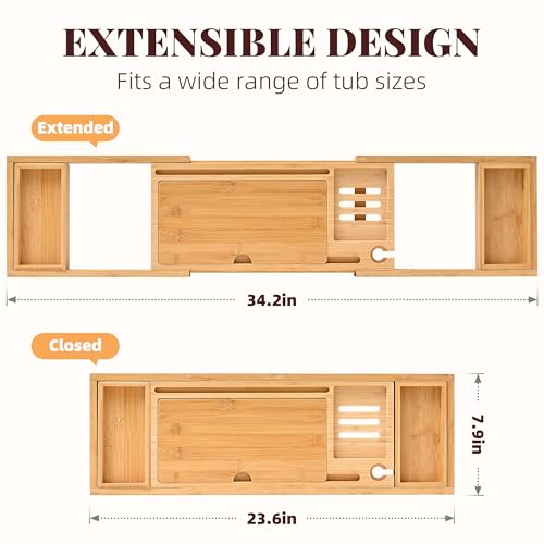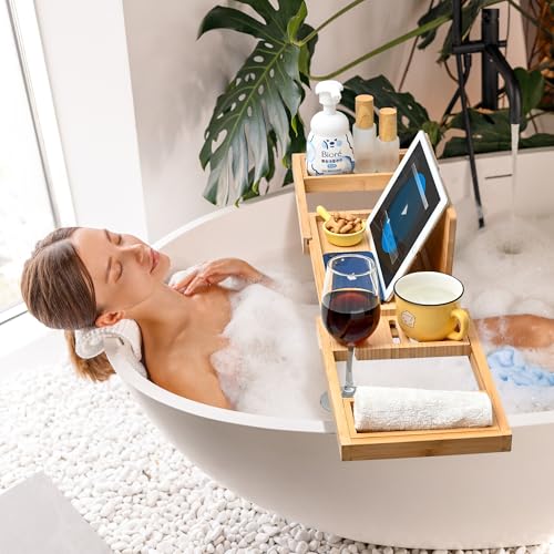 HISECOO - صينية حوض استحمام خشبية قابلة للطي من هيسيكو، صينية حوض استحمام من الخيزران قابلة للتوسيع مع جوانب ممتدة - اكسسوارات حوض الاستحمام للنساء والرجال، صينية حوض الاستحمام لحوض الاستحمام (طبيعي)