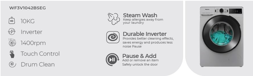 Hisense - غسالة هايسنس تحميل أمامي 10 كجم 1400 دورة في الدقيقة، لون فضي ممتاز، عاكس، تحكم باللمس، تنظيف الأسطوانة، بخار مضاد للحساسية