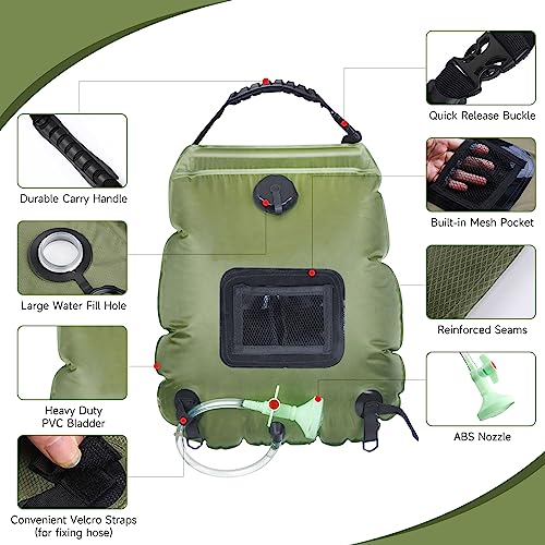 HISFFOG - شنطة استحمام محمولة تعمل بالطاقة الشمسية سعة 20 لتر من هيسفوج، مع خرطوم قابل للإزالة ورأس دش قابل للتبديل بين التشغيل والإيقاف، دش صغير للتخييم والمشي لمسافات طويلة والسفر والسباحة على الشاطئ