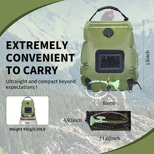 - 【شنطة الاستحمام بسعة كبيرة وحجم صغير ووزن خفيف】 بسعة مياه أكبر تبلغ 20 لتر، فإن شنطة الاستحمام التي تعمل بالطاقة الشمسية كافية لحوالي 3 مرات استحمام. تدفق المياه جيد ولطيف ليتيح لك الاستمتاع بدش أفضل ومنعش أينما، مما يمنحك تجربة استحمام أفضل. بالإضافة إلى ذلك، فإن دش التخييم الخاص بنا صغير الحجم وخفيف الوزن بحيث يمكنك حمله في شنطة الظهر الخاصة بك بشكل مريح. يبلغ وزن شنطة الاستحمام 445 جرامًا فقط، وتبلغ العبوة 33 × 15 × 5 سم فقط.