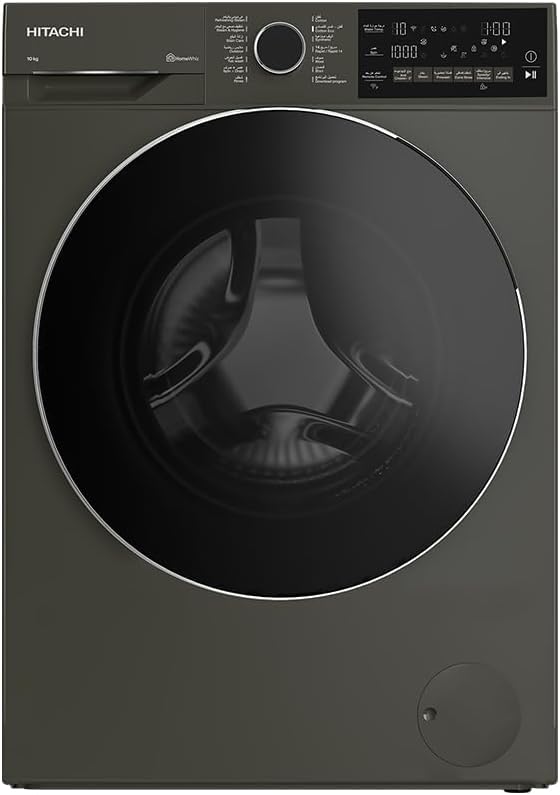 HITACHI - غسالة ملابس 10 كجم بسرعة 1400 دورة في الدقيقة وتقنية ستيم كيور ومحرك انفرتر برو سمارت وخاصية علاج بالبخار وتنظيف جاف وبرنامج سريع لمدة 14 دقيقة وبلوتوث وواي فاي وباب كبير للغاية من هيتاشي، رمادي