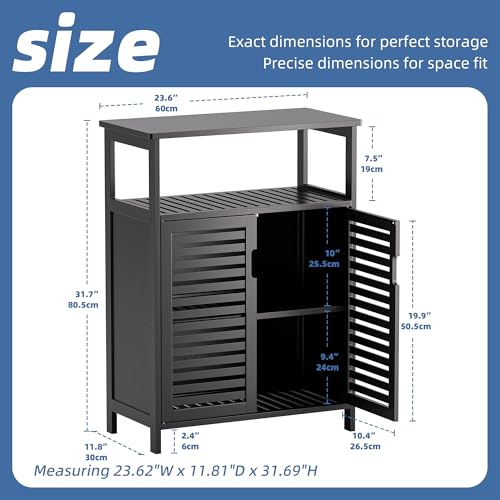 - دولاب أرضي بسعة كبيرة مع سطح طاولة عريض ورف مفتوح ورفين داخليين ثابتين مع أبواب غالقة، يوفر دولاب الحمام المصنوع من البامبو مساحة واسعة لمساعدتك على التخلص من الفوضى وتنظيم متعلقاتك. أرفف مفتوحة علوية وسفلية لعرض العناصر الزخرفية أو المستخدمة بشكل متكرر والتي تريد الوصول إليها بسهولة. يسمح لك الرفان الداخليان خلف الأبواب المزودة بفتحات بإخفاء الفوط وورق المرحاض وأقمشة التنظيف والغسيل ومنتجات التنظيف وغيرها من أساسيات الحمام