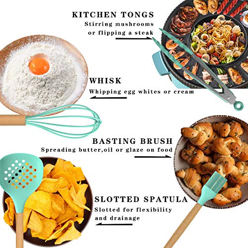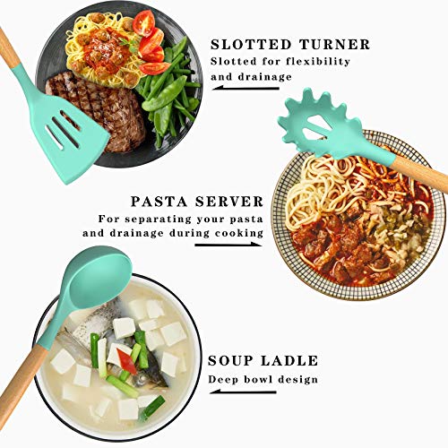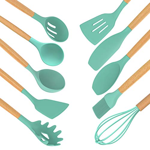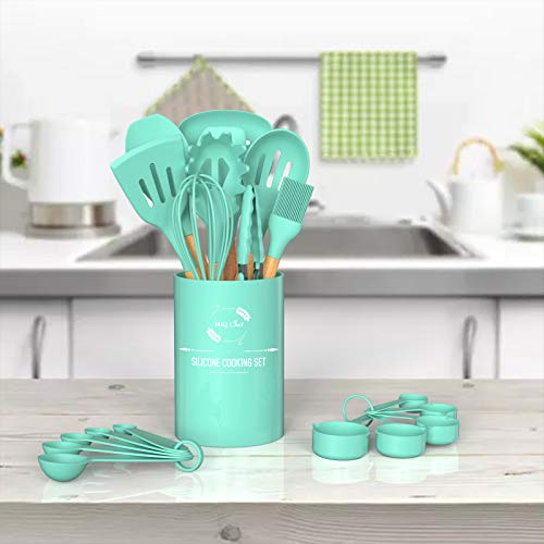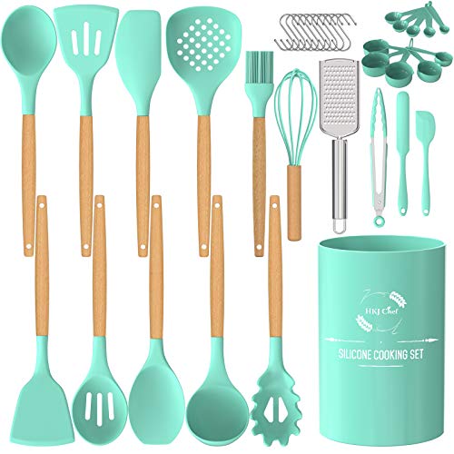 HKL Chef - طقم ادوات طبخ من 27 قطعة من السيليكون غير لاصقة ومقاومة للحرارة تشمل ملاعق سباتيولا وحامل مقابض خشب للطبخ من اتش كيه جيه شيف، اخضر