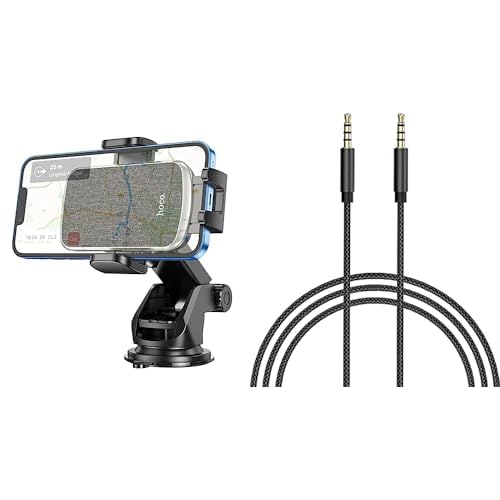 Hoco - حزمة إكسسوارات سيارة (حامل سيارة بقاعدة شفط تلسكوبية تعمل بالدفع HOCO CA95 متوافق مع آيفون وسامسونج وشاومي وأوبو وهواوي - لون أسود + كابل صوت ستيريو ايه يو اكس 3.5 ملم، لون أسود - بطول 1 متر، HDMI)