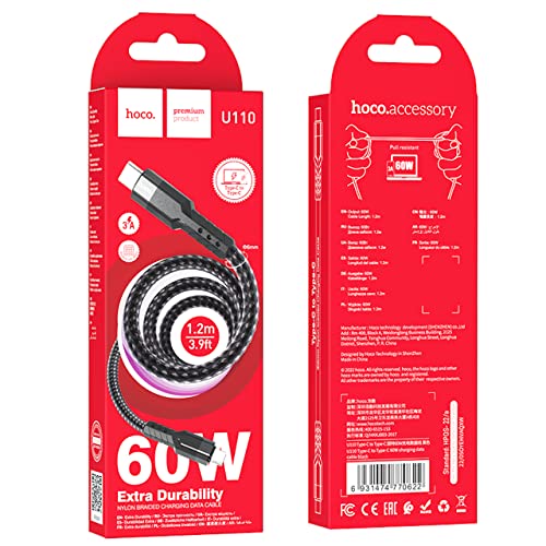 HOCO - كابل للشحن السريع ونقل البيانات من هوكو 60 وات - 3 امبير - 1.2 متر قابس USB-C إلى متوافق مع سامسونج وهواوي وشاومي واوبو - أسود موديل U110