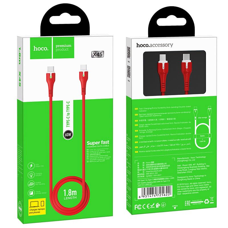 HOCO - كابل سوربلاس للشحن ونقل البيانات X45 من هوكو، PD من النوع سي إلى النوع سي - لموبايلات سامسونج وهواوي واوبو وشاومي - احمر