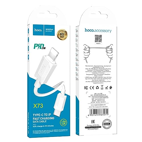 HOCO - كابل للشحن السريع ونقل البيانات X73 بي دي من هوكو (20 وات - 1 متر) كابل USB-C إلى لايتنينج، متوافق مع ابل ايفون وايباد وايربودز - أبيض